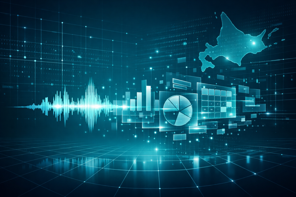 中央で発光する回路は、ラボの「デジタル・ブレイン」を高精度化させた神経網(グリッド)だ。47都道府県の入試問題を横断的にスキャンし、県境を越えて波及する出題傾向や、正答率の裏に隠された「得点の真実」をリアルタイムで捕捉する。これは単なるデータではない。勝つためのインテリジェンス(戦略情報)である。